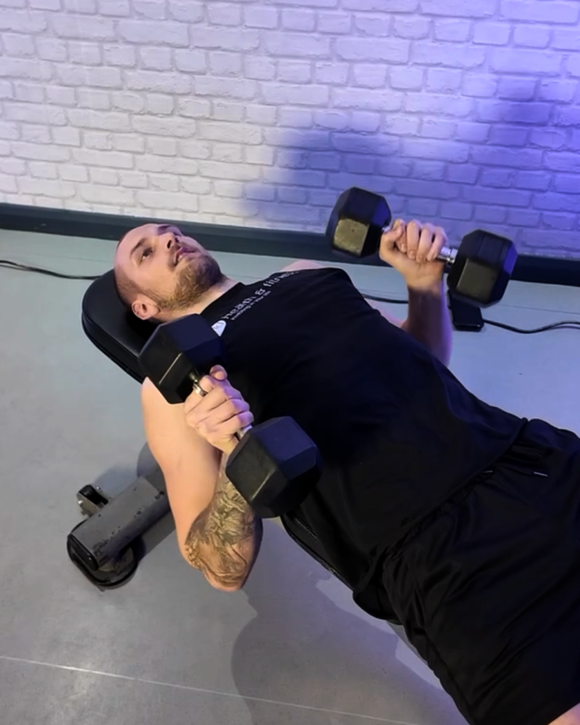 • Bring the back of the adjustable bench flat, now whilst holding dumbbells at your chest, lie back. Keep the dumbbells together in the middle and push up so your arms are extended. Then whilst keeping the dumbbells together let them come back towards your chest, but make sure your elbows stay tight to your sides. Push back up to the starting position, not flaring your elbows on the descent.