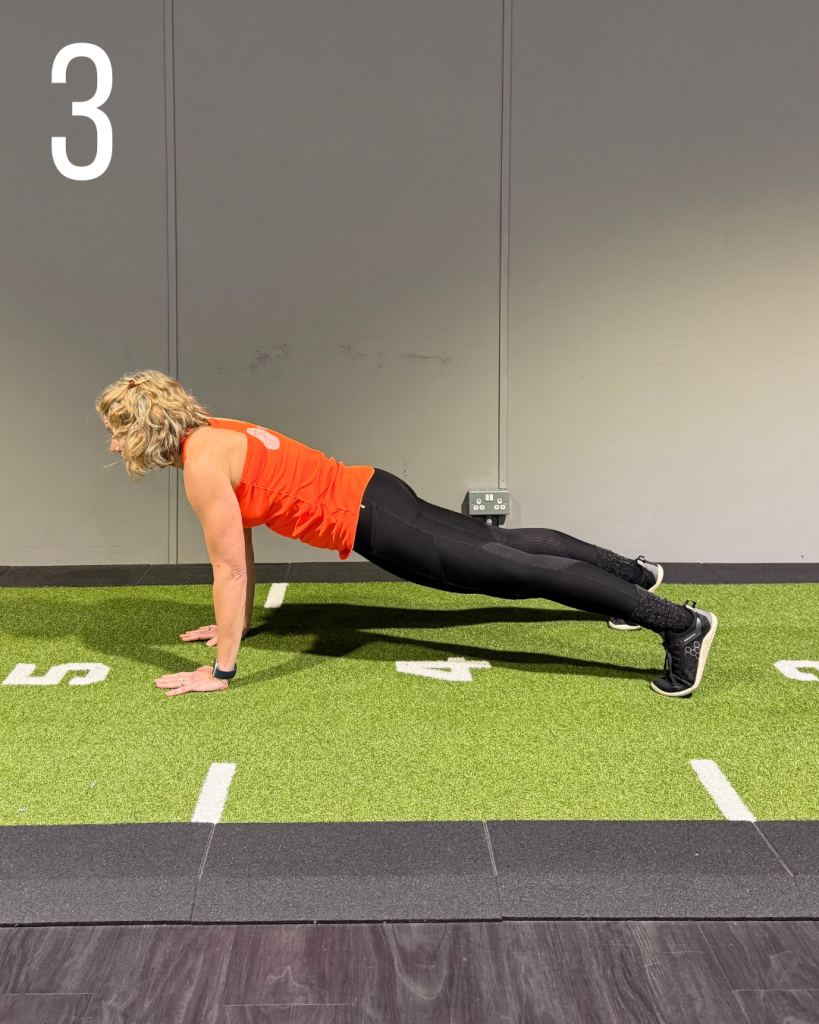 Step 4: Without too much emphasis through the arms, quickly press the floor away by straightening the elbows and jump both feet or step each foot in turn towards the hands, keeping the hips high.