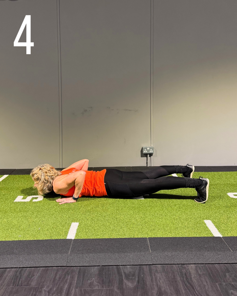 Put simply, a burpee is a squat to a plank to a press up to a squat to a vertical jump – aim for fluidity of the move as you become more proficient.