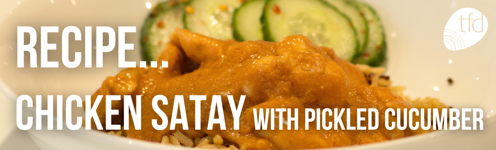 Try this quick and easy chicken satay with spicy pickled cucumber and rice!