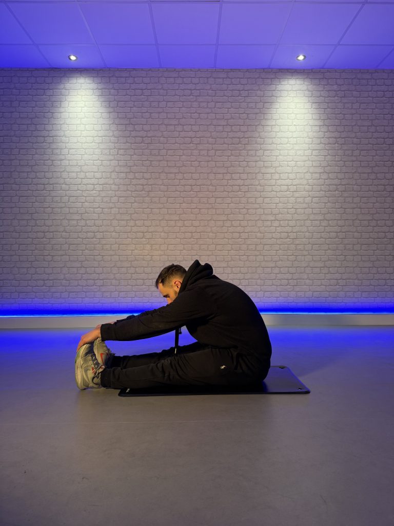 Technique: Sit on the floor with legs straight. Reach your hands towards your feet and allow your upper body to fold forward to a comfortable stretch. Targets: Hamstrings, lower back.