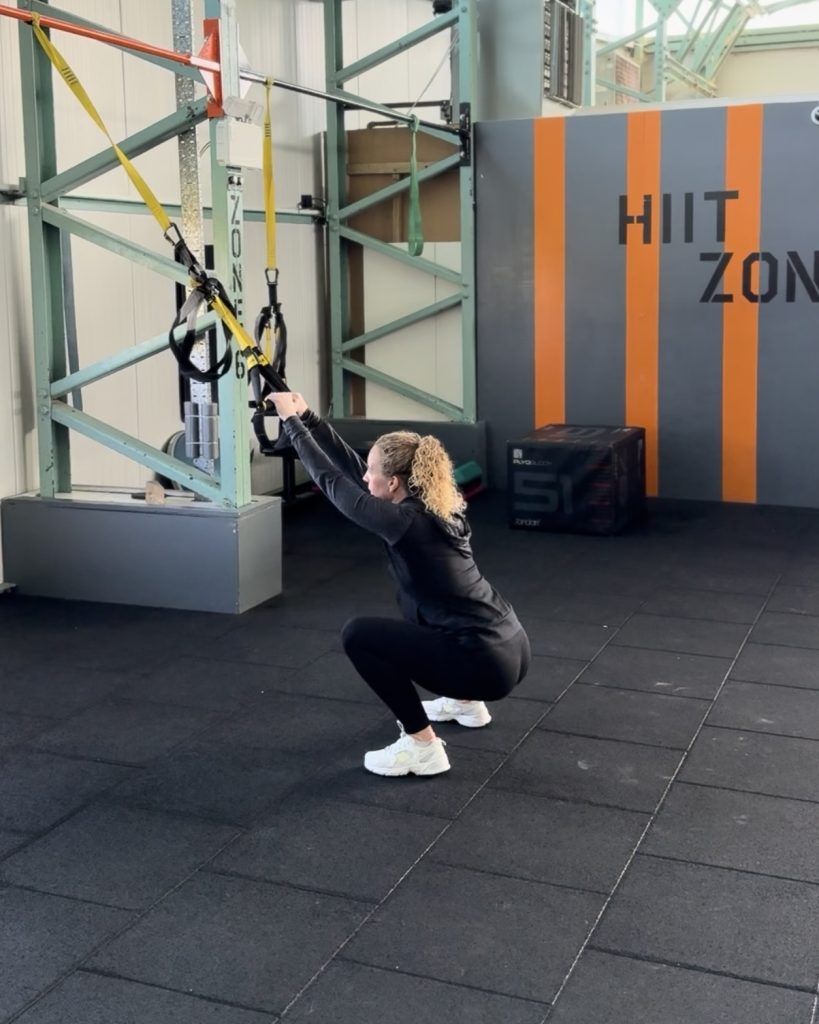 - Holding the straps in each hand, drive your hips back to lower to a squat position.