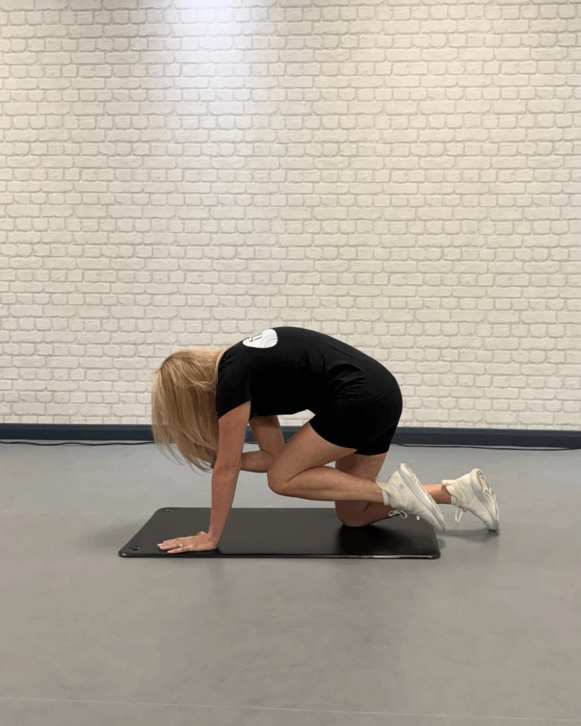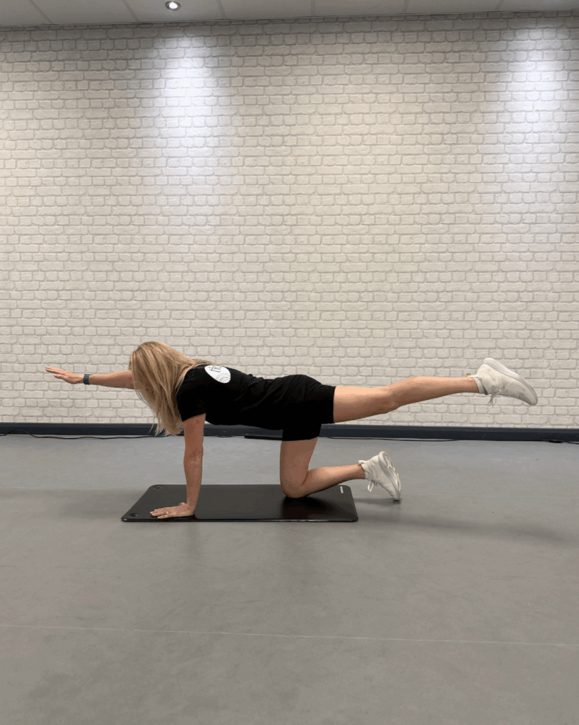 Begin on hands & knees and find a long, neutral spine. Draw the belly button up into the spine and engage the core. Extend left arm out long to shoulder height as you extend right leg long to hip height. Bring the elbow and knee in under the body as you drop the tailbone and pull the tummy in slightly more. Extend out long and repeat 5 to 6 times before doing the same with right arm and left leg again about 5 to 6 times.