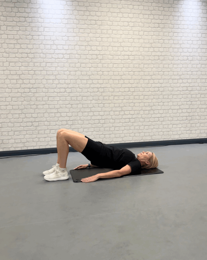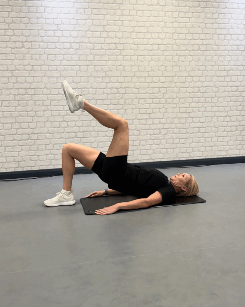 Laying on your back with neutral pelvis, slowly raise the hips and come up on to your shoulders. Tuck the tailback under and keep the hips level, raise the left leg into tabletop position and with a hinging movement from the hip, tap the toe to the floor. Try to do around 5 or 6 on the left side before lowering down and then repeating on right side.
