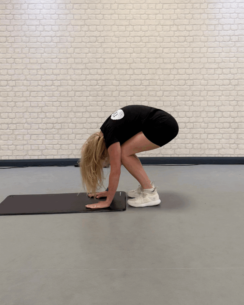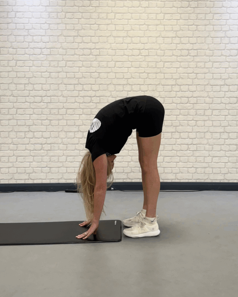Perform a roll down by starting in standing, tuck your chin, round your shoulders and pull the tummy in. Gentle start to articulate through the spine, keeping the hands close to the legs and have your crown facing down to the floor. Once at the bottom, place your hands about a foots distance in front of your feet. Bend the knees so the hands are flat on the floor and the chest is in to the thighs. As you exhale, send the hips up towards the ceiling straightening the legs and trying to keep as much of the hand on the floor as possible. As you inhale, bend the knees and bring the chest and thighs back together. Repeat a few times both ways.