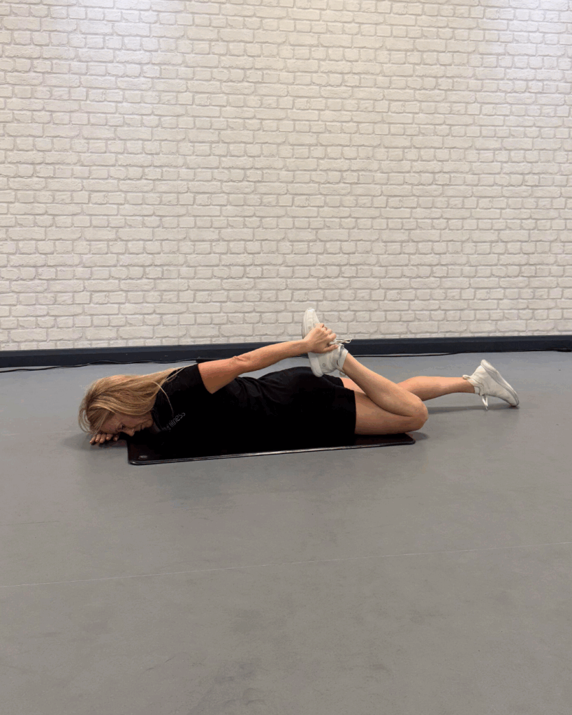 Lie face down on the mat, bring a foot in towards the bottom and take hold with your hand. Apply gentle pressure and keep drawing in as you breathe into the stretch more whilst keeping the hips pressing down into the mat. Continue for a few inhales and exhales. Then, push the foot heavier into the hand and as you exhale, raise the leg as though you are sending the bottom of the foot to the ceiling. Inhale to lower back down and repeat for a few breaths.