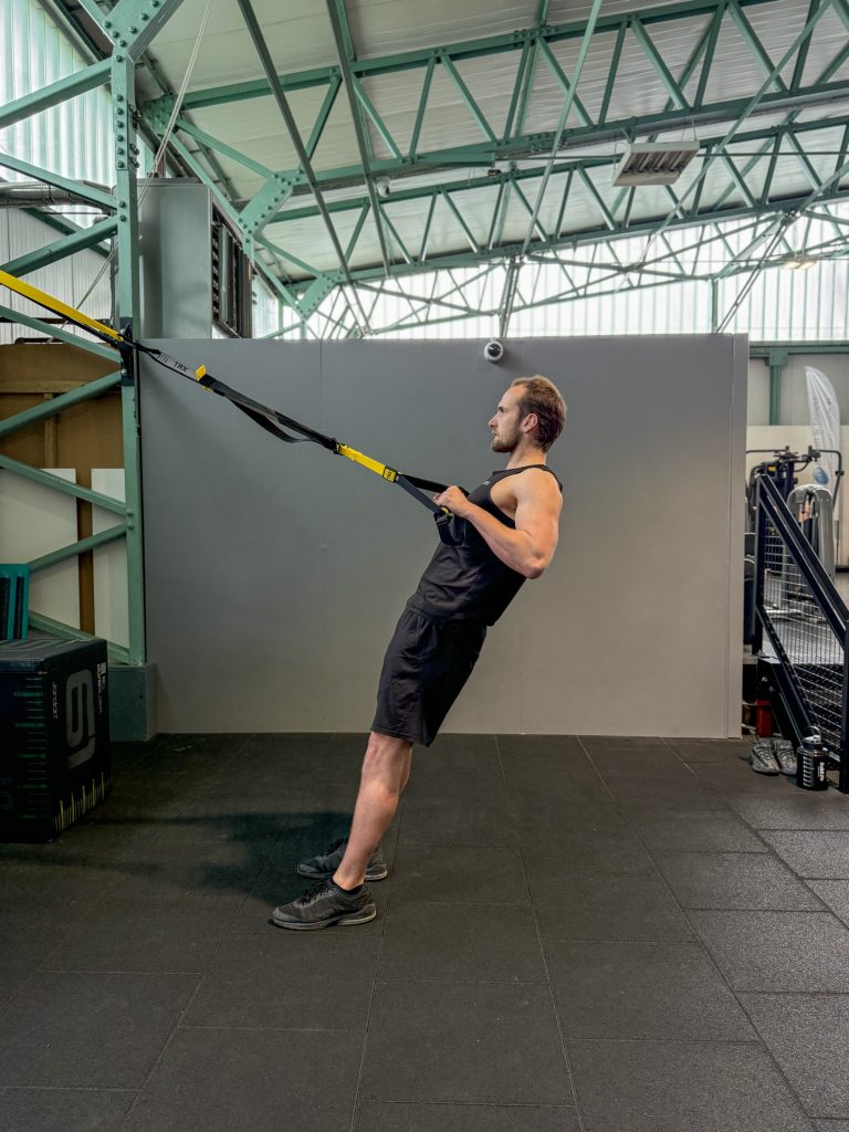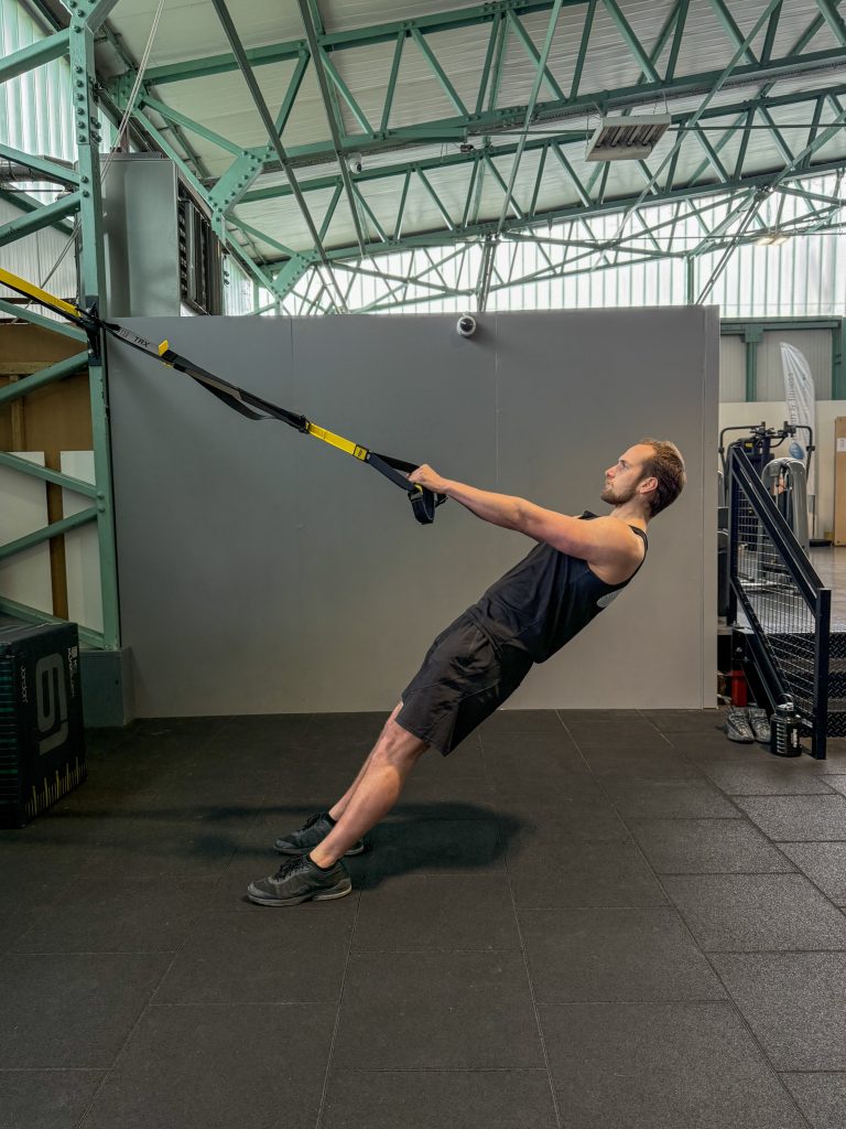 - Hold onto the rubber handles on the TRX and take a step forwards. Now slowly lower yourself backwards, taking tension into the straps. Whilst your leant back, your torso and legs should be a straight line. Now straighten your arms, and finally pull yourself towards the handles while keeping the elbows to your sides and repeat the previous steps.