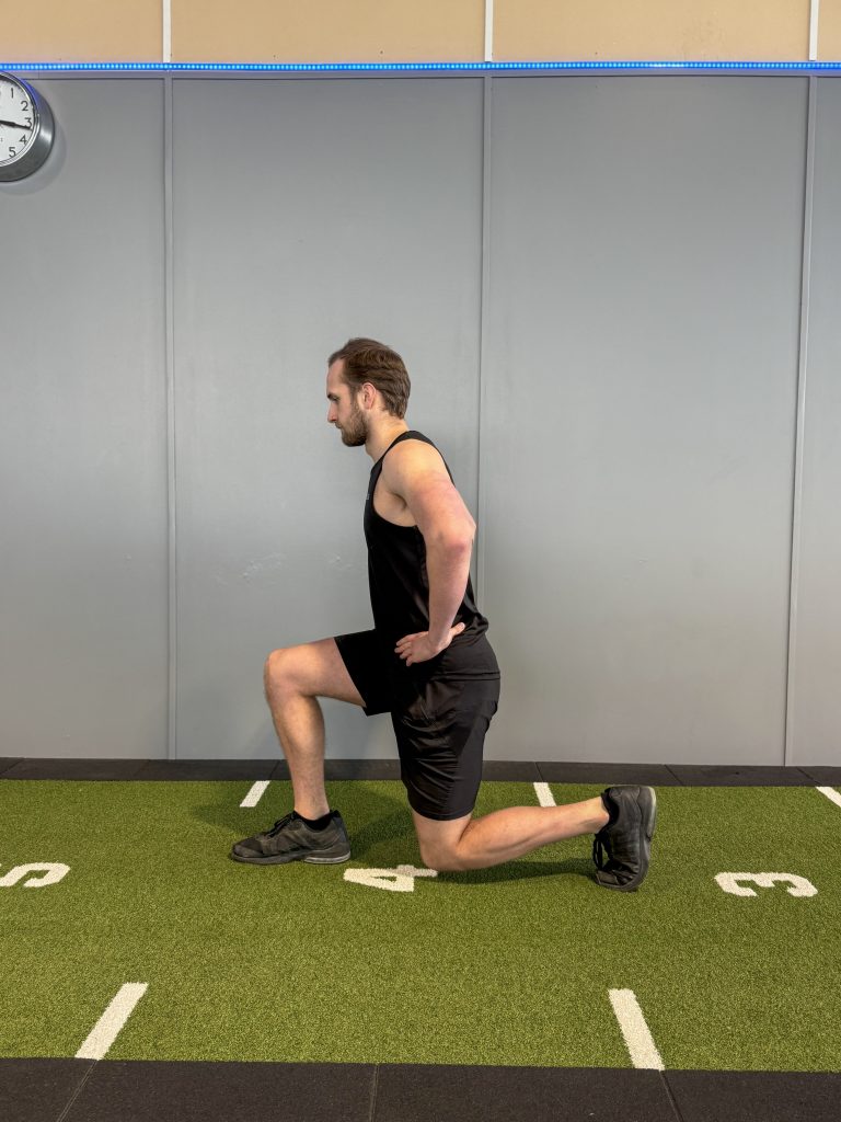 - Start standing up with your legs together, now step one foot forward, bringing your rear knee to around an inch off the ground, bending your front knee in the process. Both your knees should be at right angles when at the bottom of the rep. Now you come back into a standing position, switch legs and repeat.