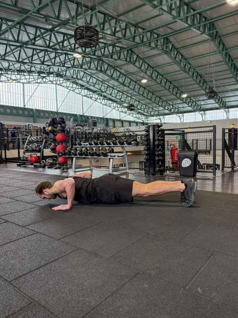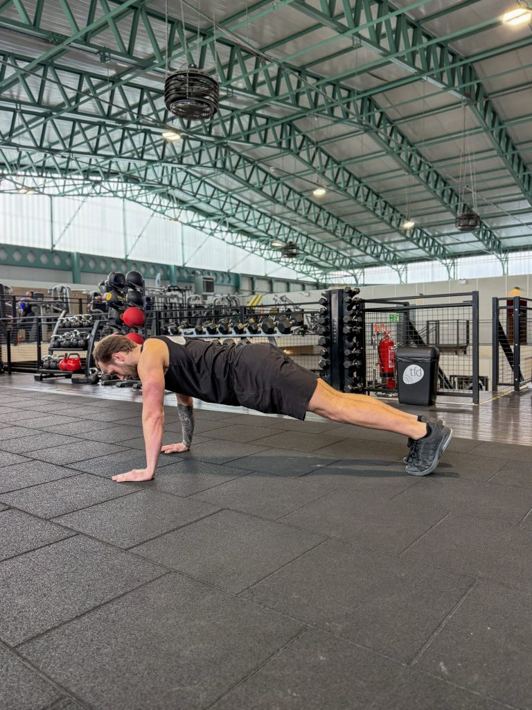 - First of all, get onto all fours and place your hands either side of you on the floor. Come up onto your toes and whilst keeping your torso and legs in a straight line, slowly lower your body to the floor. Your elbows should be at a slight angle towards your body rather than directly to the sides, now finally, push your body back up to the start point and repeat (Tip: at the bottom of the rep your hands should be in line with the middle of your chest).
