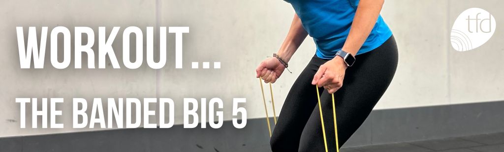 Yellow looped band – double up the band and stand on it with feet hip width apart, holding the loops you have made with the band at each side of your legs. To find the tension, engage your core and move your hands lower down the band – the closer your hands are to your feet at the start of the move, the more tension there will be.  Hinge at the hips, stick your butt back and lift your tailbone, soften the knees a little and drive through the feet to come to standing keeping the core pulled to the spine. Squeeze your glutes at the top being careful not to over-extend in your back.